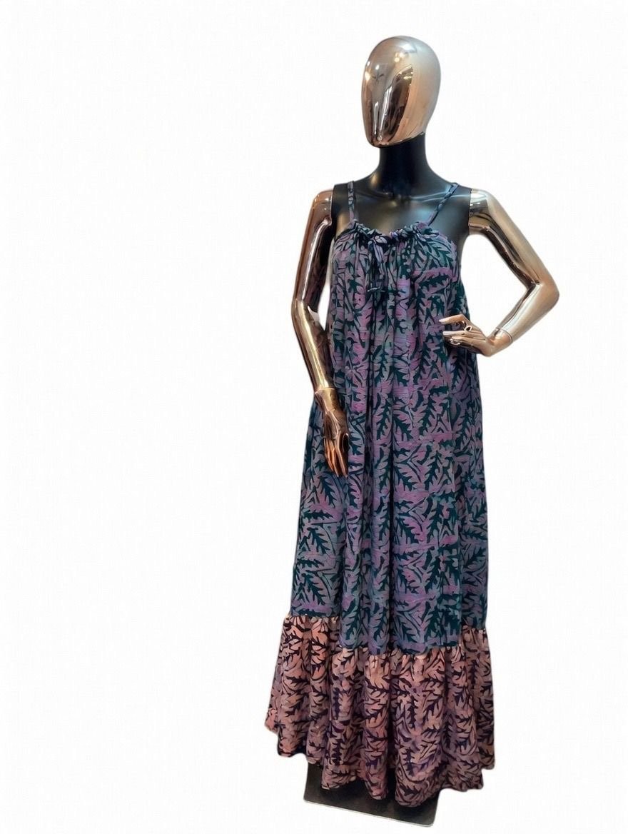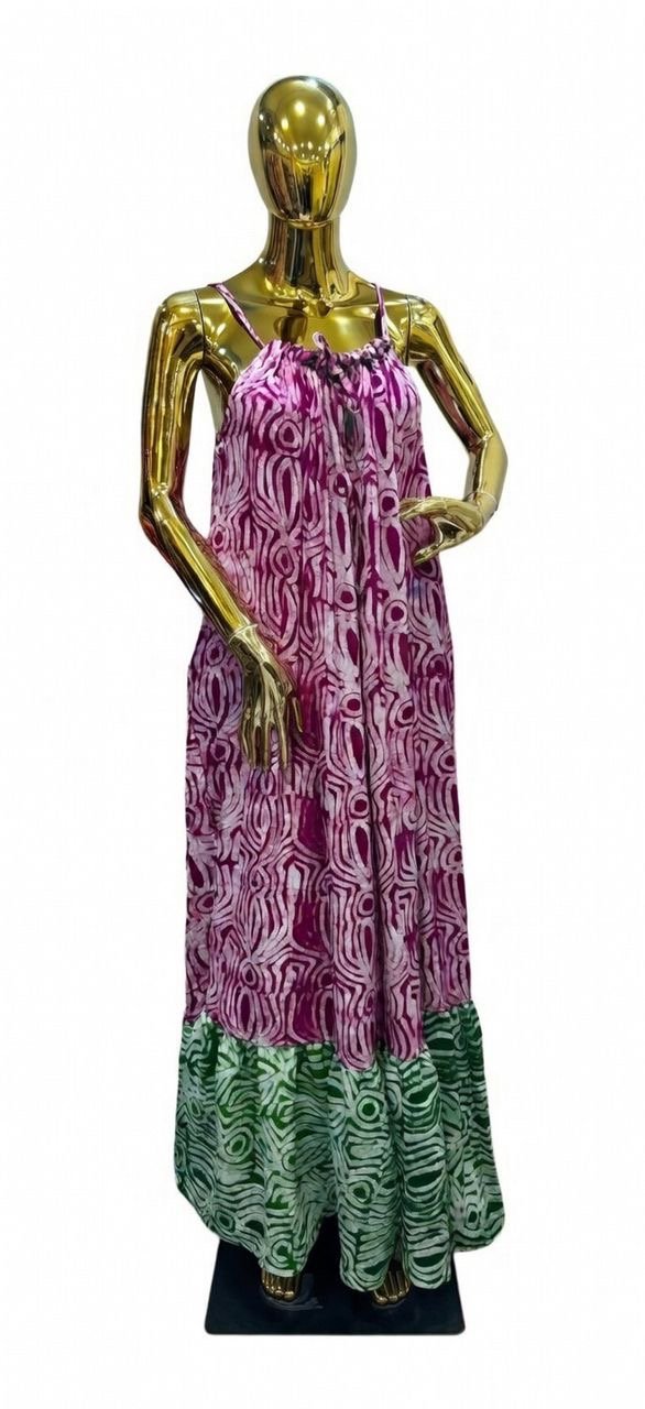 Stylish sleeveless adire maxi dress,designed with adjustable straps and a relaxed,flowy fit Perfect for warm days,casual outings or vacations
