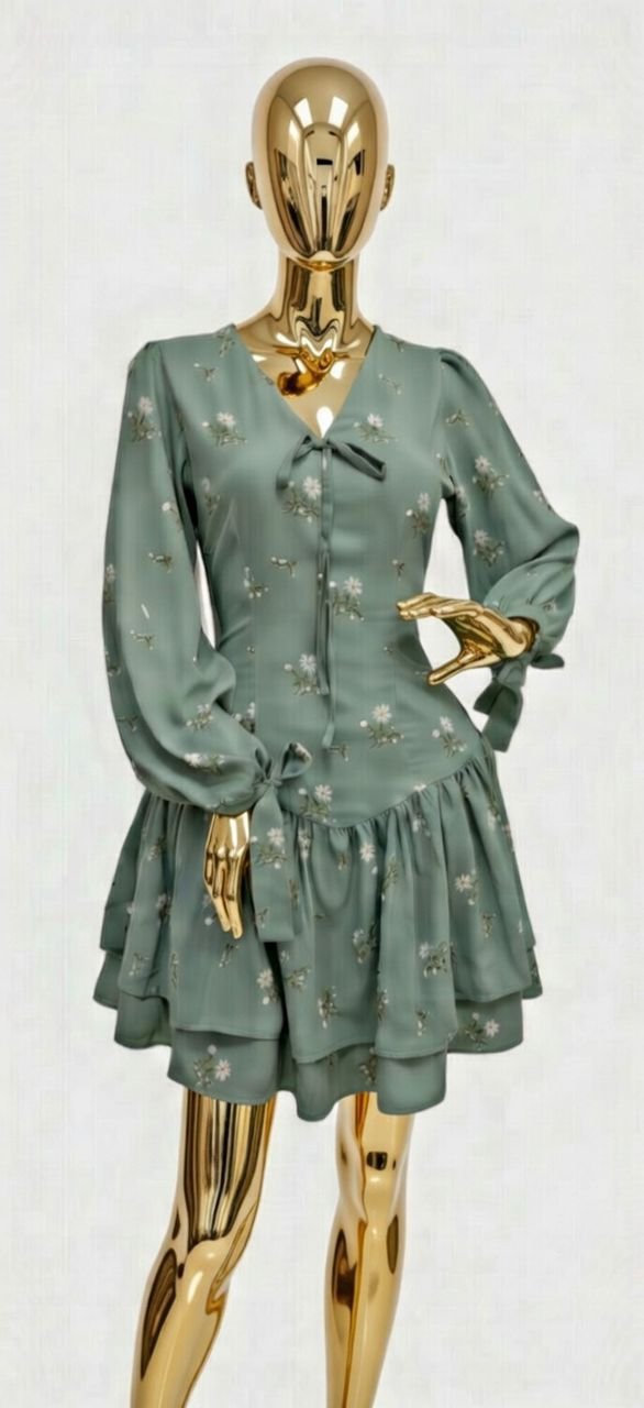 Featuring a flattering V-neckline, The dress is adorned with a delicate floral print that brings a fresh, romantic feel, perfect for any season. Its multi-tiered skirt creates graceful movement with every step, adding volume and a playful, airy silhouette. Designed with flowy long sleeves, it offers a light, breezy feel while maintaining a refined look. The relaxed fit ensures all-day comfort without compromising on style, making it perfect for brunch dates, garden parties, or special occasions.