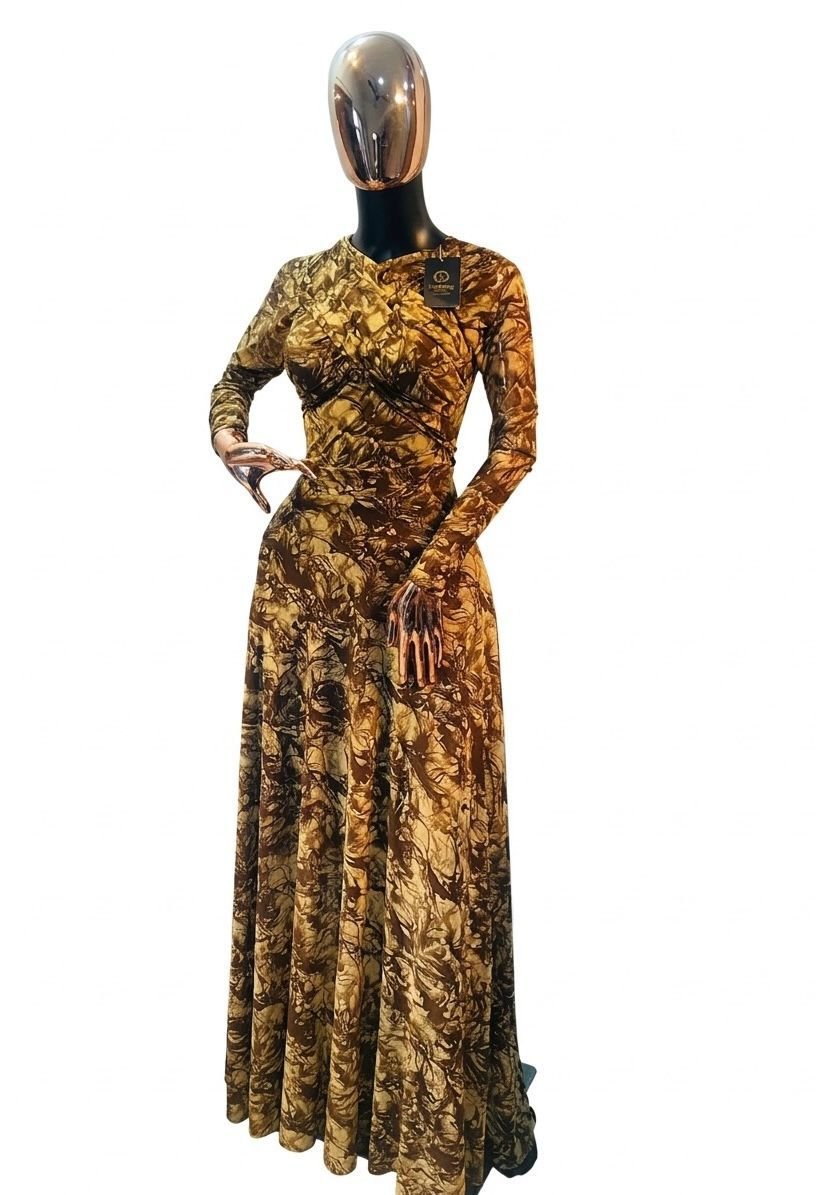 Elegant long-sleeve maxi 2 piece featuring a rich gold and brown abstract print, designed with a flattering fitted bodice and flowing skirt for a graceful, statement look