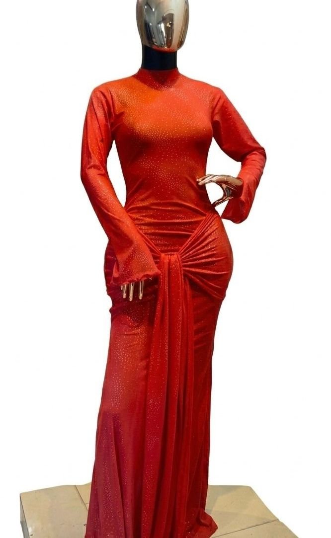 A striking red mesh gown featuring shimmering silver stone embellishments, a sleek turtleneck, and elegant long sleeves. Designed with a cinched waist and flowing draped details, it creates a bold, sophisticated silhouette perfect for standout occasions,